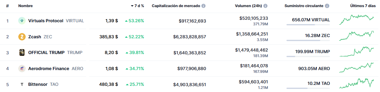 5 criptomonedas y tokens con mayor subida en los últimos 7 días.