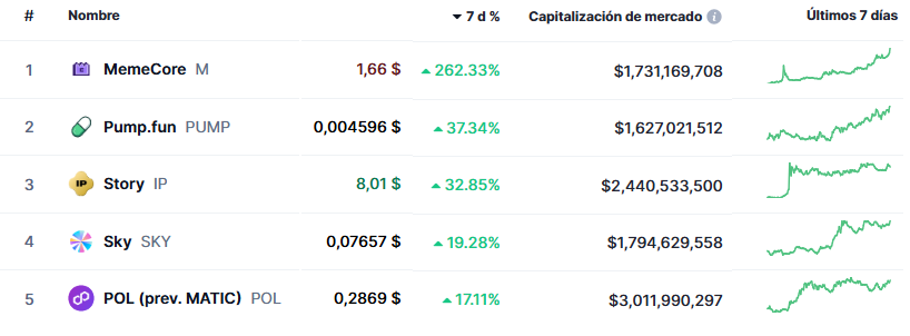 | | | | ☄️ La fuerza de los memes eleva a M | | | | | El primer lugar del ranking semanal fue para memecore (M), la criptomoneda de una red relativamente nueva —listada en los principales agregadores desde julio de este año— que capitalizó de lleno una narrativa dominante de 2025: las memecoins. Este proyecto logró generar una comunidad vibrante gracias a su estrategia de marketing, centrada en su mascota "Sato", con reminiscencias al estilo de PancakeSwap durante el auge de 2020–2021. Esta imagen amigable se tradujo en mayor tracción en redes sociales. A esto se le suman colaboraciones y alianzas, como la que recientemente anunció con el protocolo de financiación, D.Pump. Además de la narrativa, Memecore aportó desarrollos concretos: el lanzamiento de su propia wallet y la participación en eventos como Neovibe Tokio 2025, que sirvieron de plataforma de visibilidad global. Estos hitos consolidaron la percepción de que no se trata de un simple token especulativo, sino de un ecosistema con aspiraciones de expansión. La pregunta de corto plazo es si la comunidad logrará sostener el impulso en un mercado donde los ciclos de hype de memecoins suelen ser efímeros. Por ahora, memecore brilla como el ejemplo más reciente de cómo la cultura y el marketing pueden traducirse en rendimiento. | | | | Precio de M durante los últimos 7 días | | | | 🚀 Los memes también impulsan a pump.fun | | | | | El segundo activo en el podio semanal fue pump.fun (PUMP), el token de la plataforma que permite crear memecoins sobre Solana. Aunque su propuesta ya era conocida, lo que marcó la diferencia fueron las recompras de tokens iniciadas a finales de agosto, que quitaron presión de oferta y sostuvieron el precio en niveles crecientes. Además, el gran catalizador de la semana fue el anuncio del proyecto Ascend, que busca ampliar la utilidad de pump.fun más allá de la simple creación de memecoins. La apuesta apunta a transformarse en un hub de herramientas y servicios dentro del ecosistema de Solana, con un enfoque en la escalabilidad y el soporte a desarrolladores. El mercado reaccionó con entusiasmo, interpretando que el protocolo tiene capacidad de evolucionar desde una moda pasajera hacia un actor más relevante en la infraestructura de Web3. Aun así, el desafío será demostrar que esta narrativa se respalda con métricas reales de uso y no queda limitada a un entusiasmo de corto plazo. | | | | Precio de PUMP durante los último 7 días. | | | | 🧩 Una historia por escribirse | | | | | En el tercer lugar aparece story (IP), la criptomoneda de un protocolo enfocado en la gestión de propiedad intelectual. Lanzada en febrero de este año, la red todavía conserva el atractivo de la novedad, algo que suele atraer flujos especulativos en busca de potencial de multiplicación. El lanzamiento de fondos de inversión en IP por parte de Grayscale ha ayudado a otorgarle visibilidad. Durante la semana, story celebró hitos relevantes en su hoja de ruta como la llegada a 1.000 tokens creados (es decir, a 1.000 registros de propiedad intelectual). El mercado parece valorar especialmente la propuesta del protocolo Story: ofrecer un marco de licencias y regalías transparentes on-chain, algo que podría encontrar tracción en industrias como la música, el arte y el entretenimiento. Aunque todavía es temprano para medir su impacto real, el desempeño del token refleja el entusiasmo por un nicho en plena expansión.