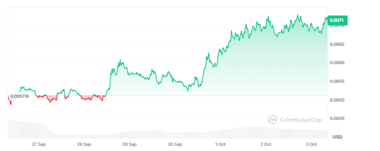 | | | | ¡Se tambalea el mercado! ¿La razón? El gran rendimiento de pump.fun (PUMP), el token de la plataforma que permite crear memecoins en la red Solana. En los últimos 7 días, la cotización de PUMP pasó de 0,005 a 0,007 dólares, lo que representa un incremento del 40%. | | | | Precio del token pump.fun durante los últimos 7 días. | | | | | El 1 de octubre es un día histórico para este activo. Fitell Corporation, especializada en ventas de equipos de gimnasio y fitness que cotiza en el Nasdaq, invirtió 1,5 millones de dólares para conformar una reserva corporativa de PUMP. Según se informó, la compañía adquirió 216,8 millones de PUMP para fortalecer su tesorería de solana (SOL). El token debutó en el mercado el 12 de julio, por lo que es difícil hacer una predicción del precio basada en análisis técnico.
